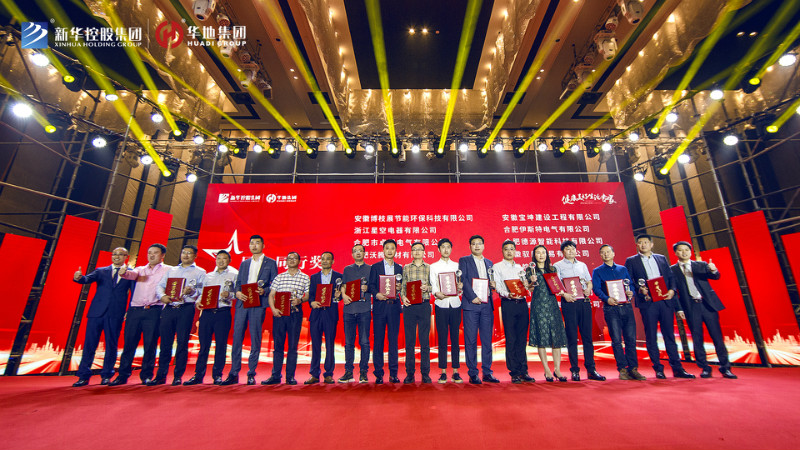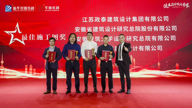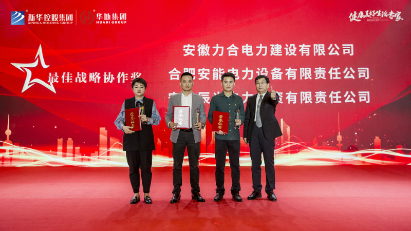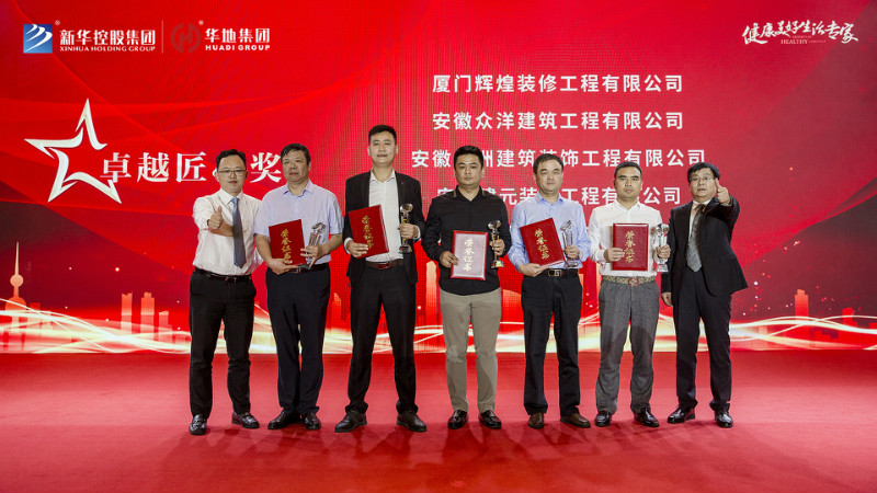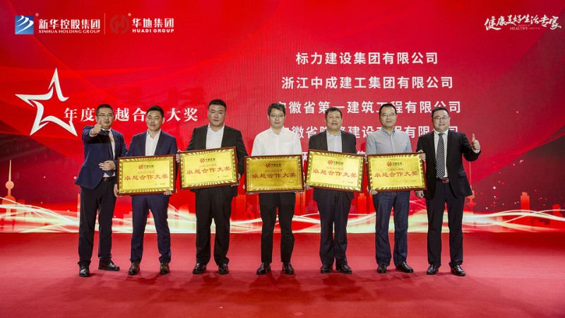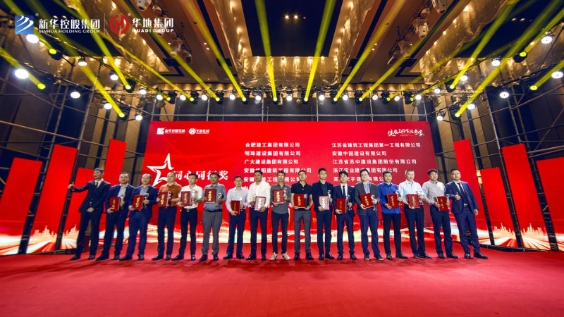最后新華控股集團(tuán)副總裁兼華地集團(tuán)執(zhí)行總裁吳守狀先生、 新華控股集團(tuán)副總裁兼華地中安總經(jīng)理黃傳偉先生共同為標(biāo)力建設(shè)集團(tuán)有限公司、安徽省隆峰建設(shè)工程有限公司、浙江中成建工集團(tuán)有限公司、天元建設(shè)集團(tuán)有限公司、安徽省第一建筑工程有限公司頒發(fā)“年度卓越合作大獎(jiǎng)”,將本次盛典氣氛推向高潮。