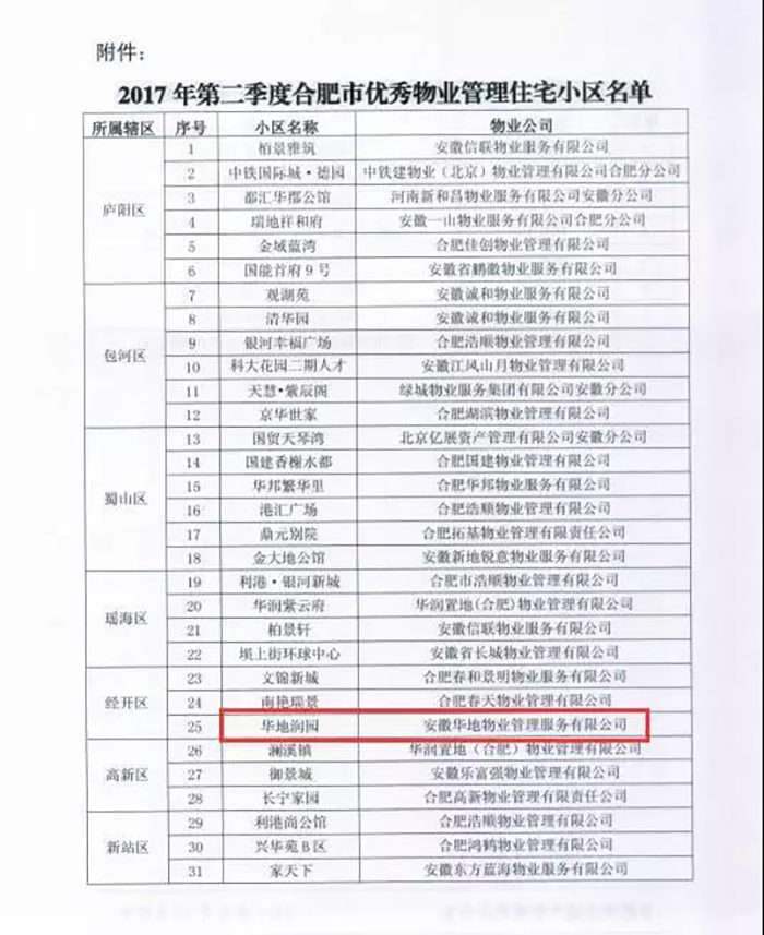 近日,合肥市房地產局發布通報、公布了“2017年第二季度合肥市優秀物業管理住宅小區”名單,華地物業服務的華地潤園名列其中,成為全市31個獲此殊榮的住宅小區之一。