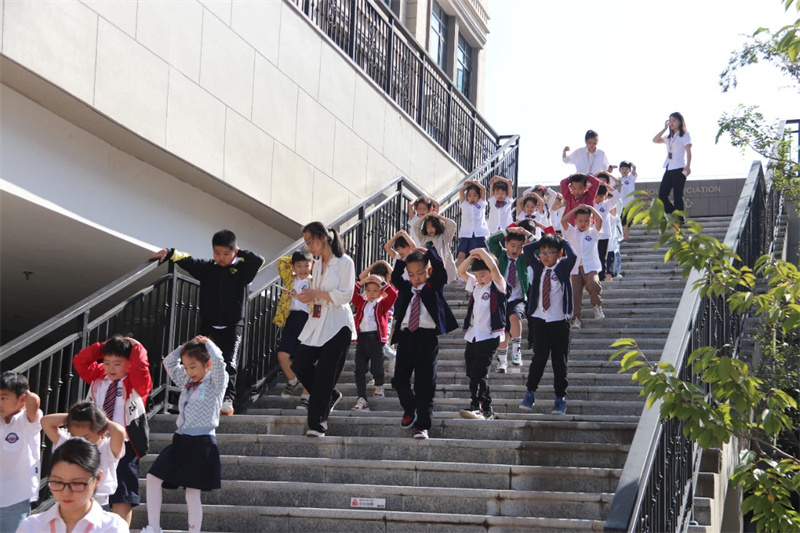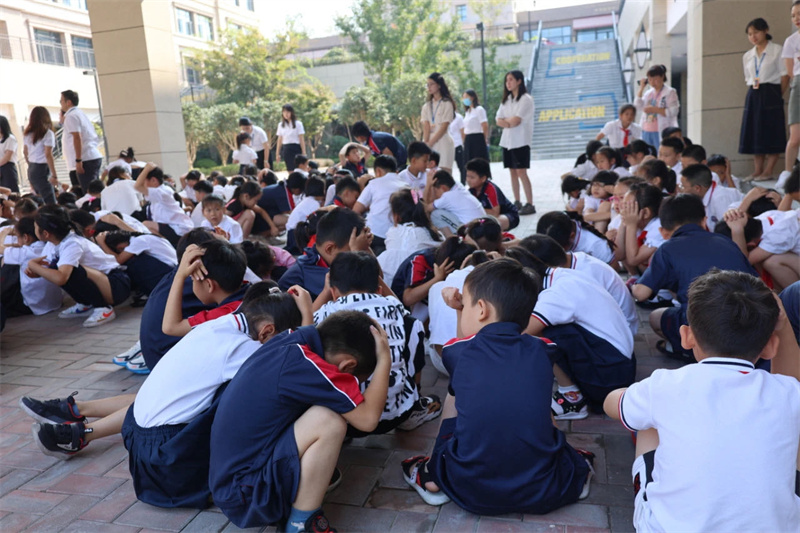 之后在凄厲的空襲警報聲中,大家立即抱頭蹲下或快速就近躲避,以防傷害。解除警報悠悠響起后,班級教師按照預定位置集中整隊,清點學生人數,匯報疏散情況,演練順利完成。