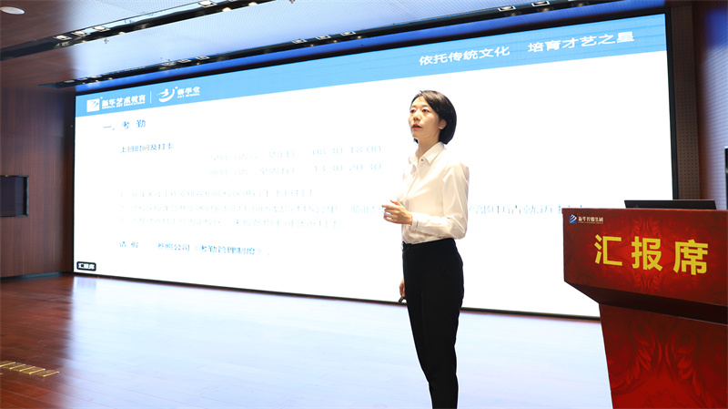 隨后,在激昂的樂曲和熱烈的掌聲中,主席臺領(lǐng)導(dǎo)走上舞臺共同開啟藝學(xué)堂教育教學(xué)質(zhì)量月啟動儀式。啟動儀式后,藝學(xué)堂教學(xué)管理中心助理總監(jiān)崔露璐做《教學(xué)管理制度培訓(xùn)》,對藝學(xué)堂教師管理制度做了詳細的解讀,并對日常教學(xué)規(guī)范提出了更高的要求。