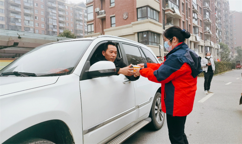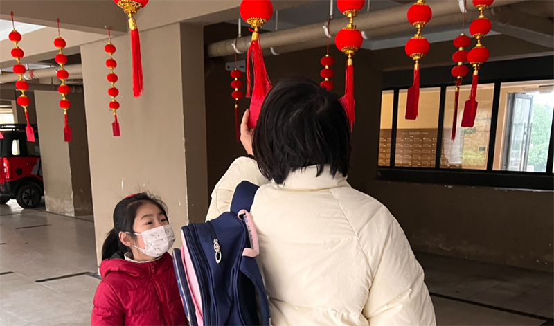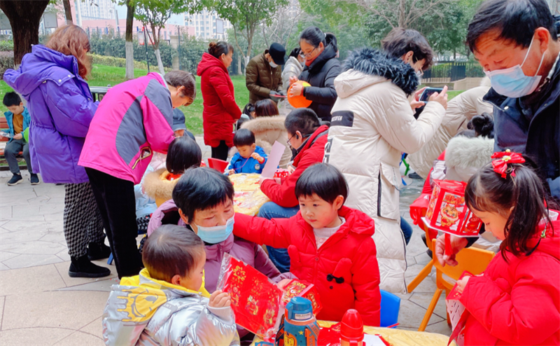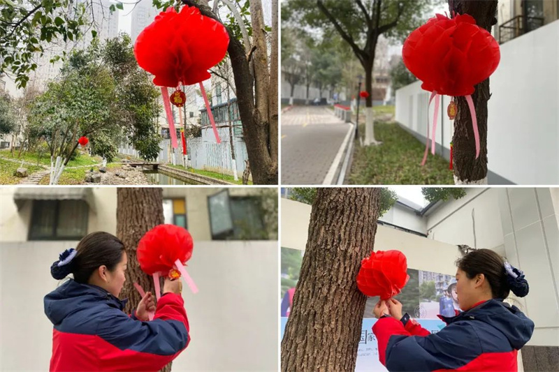 在徽商城市庭院,物業(yè)服務(wù)人員沿著園區(qū)主干道進行元宵燈謎的設(shè)計,來往的業(yè)主紛紛參與其中,沉浸在節(jié)日喜慶的氛圍里。
