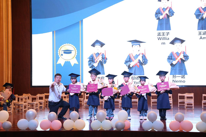 張寧校長(zhǎng)、溫晨瑋校長(zhǎng)和萬(wàn)毅園長(zhǎng)為大班的孩子們頒發(fā)畢業(yè)證書(shū)。