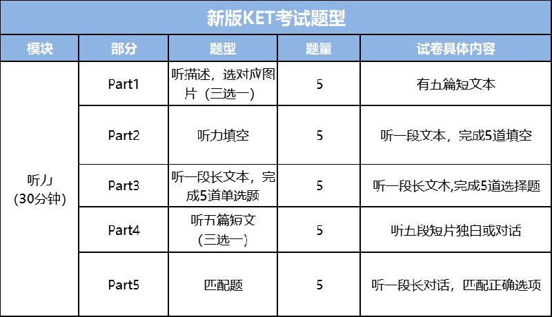 我們再來看看KET考試概況,KET主要考察四大方面,聽、說、讀、寫四大部分,每一部分的題量和分值如下: