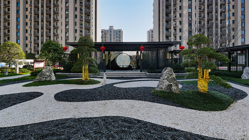 華地以門為界,輔以綠植綠化及水景小品,劃界社區(qū)內外兩重境界,一重門樓成為城市與“謐境”的分界線,疏密有致的樹叢隔離喧囂,營造一方靜謐天地。