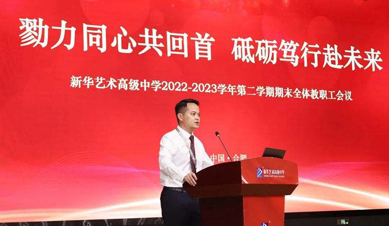 盛情夏季,桃李芬芳;潛心育人,賡續前行。為發揮黨建的引領作用,推動學校工作高質量發展,凝聚新征程再出發的奮進力量,7月11日下午,新華藝術高級中學全體教職員工歡聚一堂,隆重召開以“勠力同心共回首,砥礪篤行赴未來”為主題的2022-2023學年第二學期期末全體教職工會議。新華藝術高級中學校長邵忠德,副校長蔡賢滿、李愛國、吳東、方明生等領導及全體教職員工參加,大會由黨政辦公室主任夏娟娟主持。