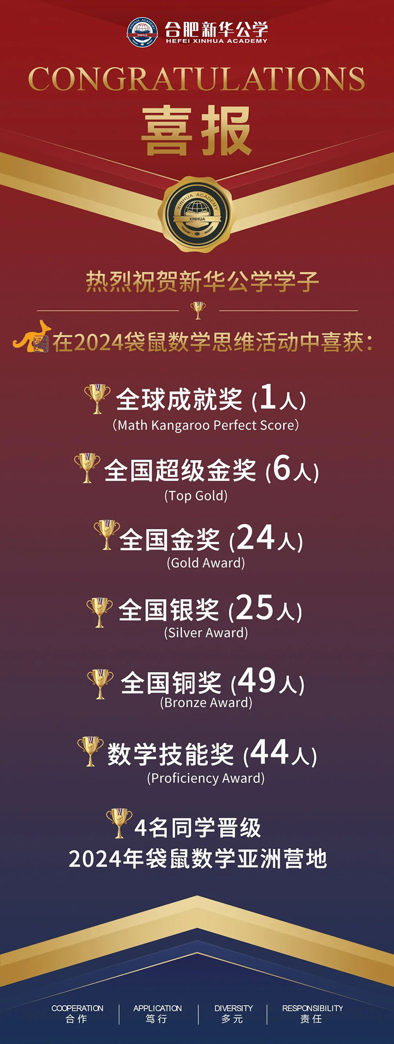最后,再次祝賀所有獲獎(jiǎng)同學(xué)與參賽同學(xué)!對(duì)數(shù)學(xué)的興趣只是起點(diǎn),而在自己感興趣的領(lǐng)域深入鉆研、甚至選擇了高出自身年級(jí)的難度等級(jí)來(lái)挑戰(zhàn)自己,這樣的自信力與勇氣更為可貴!我們希望參賽的每一位新華學(xué)子,都能因這樣亮眼的成績(jī)而獲得成就感,在以后的學(xué)習(xí)中充滿(mǎn)動(dòng)力、再創(chuàng)佳績(jī)!