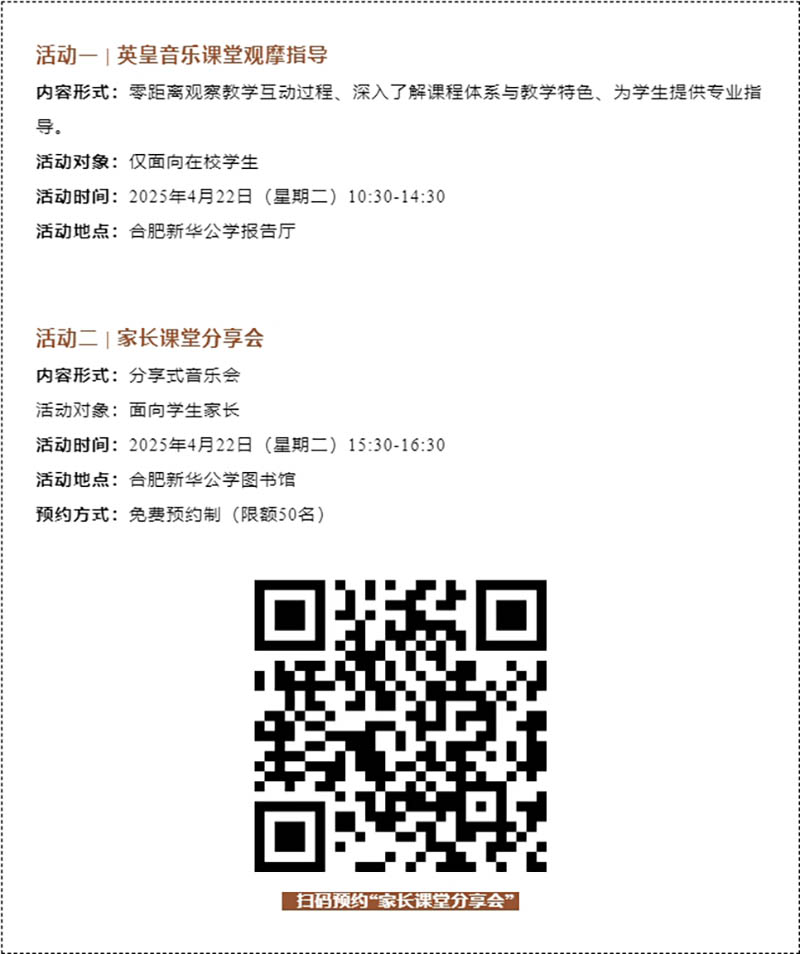 4月22日大師們將參訪開展英皇音樂課程教學(xué)的合肥新華公學(xué),為師生提供更加專業(yè)的藝術(shù)點撥。此次音樂大師的傾情指導(dǎo),必將對我校音樂教育水平的提升產(chǎn)生深遠(yuǎn)影響,為師生帶來彌足珍貴的藝術(shù)啟迪